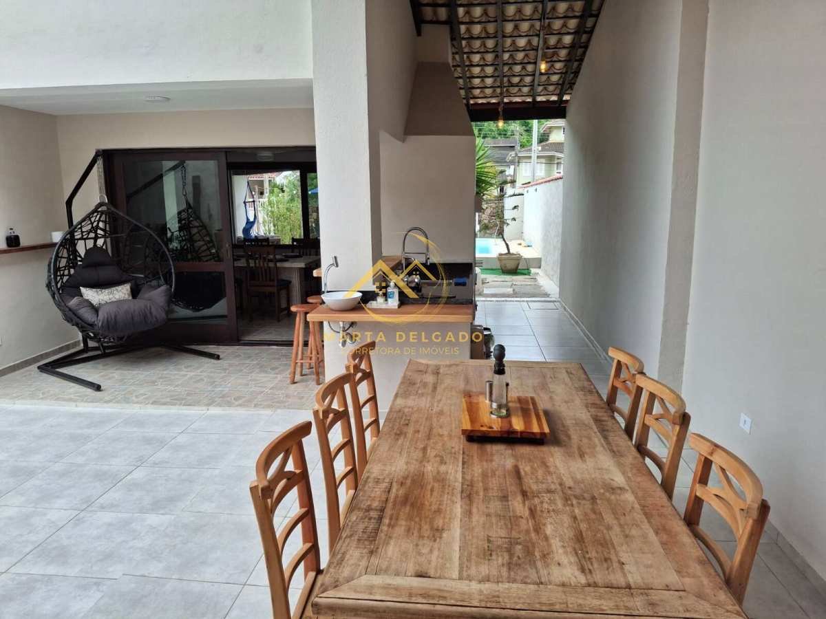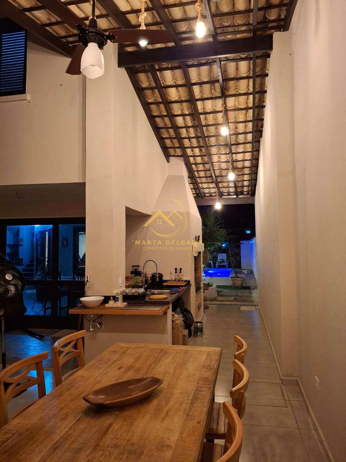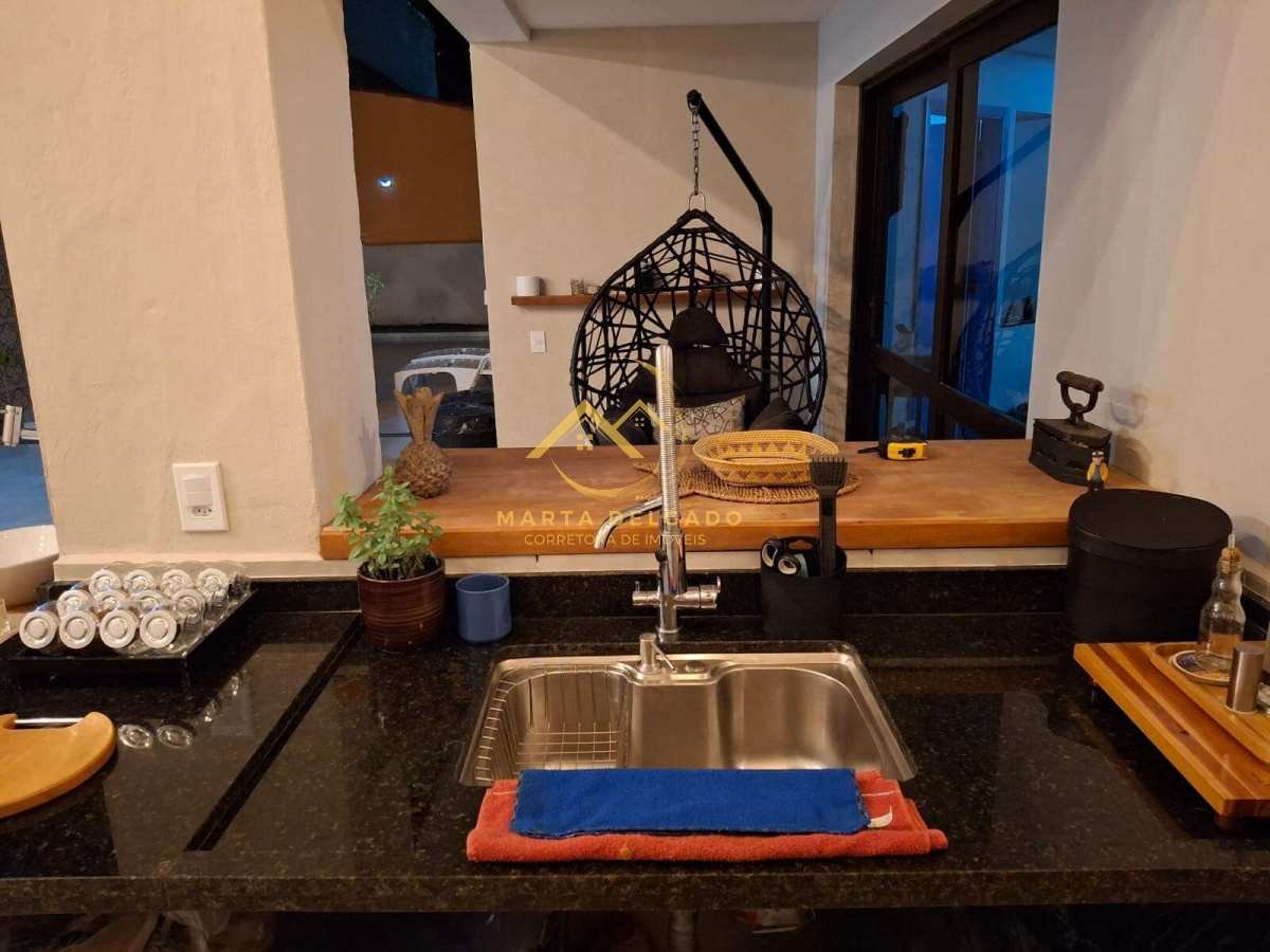 Área gourmet integrada com a piscina com churrasqueira, pia de granito e cubas novas, torneira monocomando com aquecimento, água da caixa e da rua, pia de apoio, ventilador de teto.